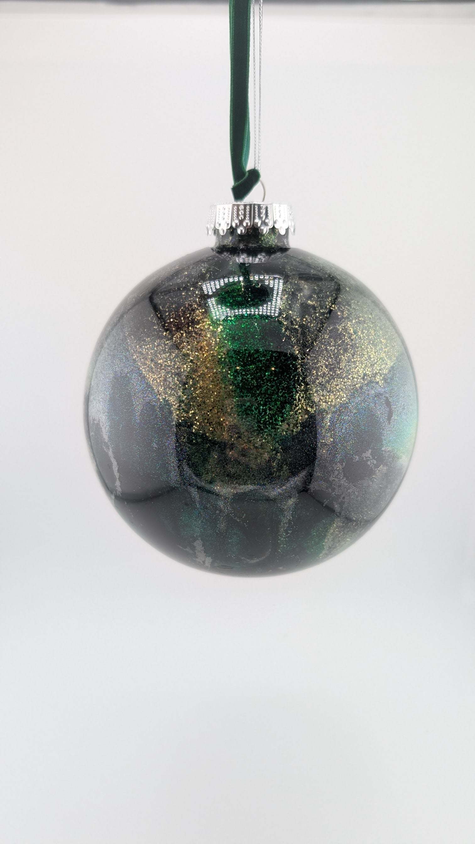 Our larger version of the Evergreen Dusk design, this 3.15" ornament is rich with swirling pine green and gold tones, reminiscent of starlit forests.